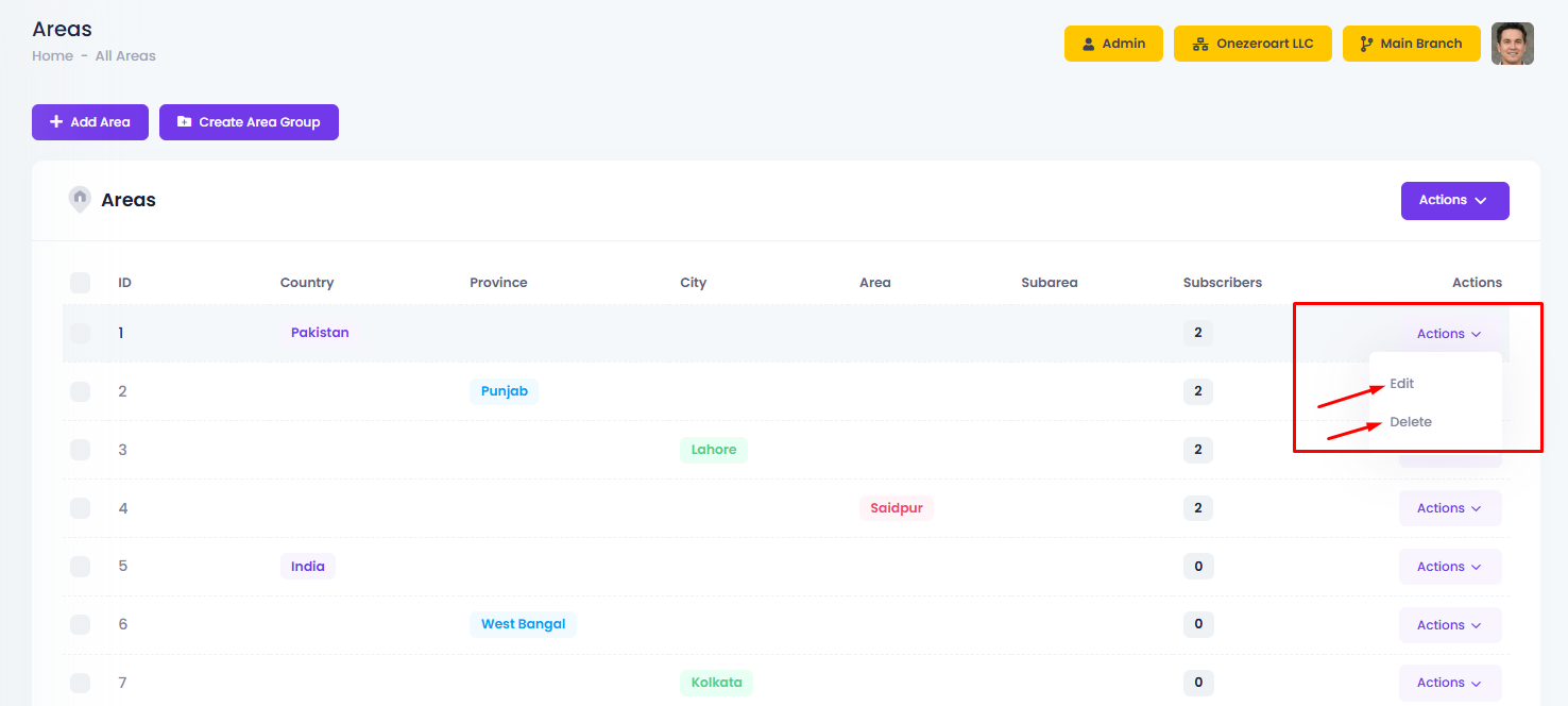 After adding an area, if you want to make changes or delete it, click the Action button. To modify details, select Edit; to remove the area, select Delete.