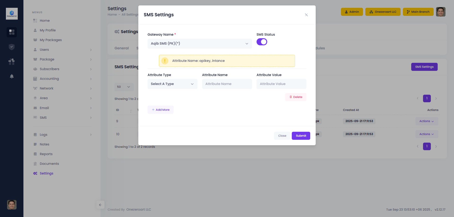 The SMS Integration module allows administrators to connect third-party SMS gateways with ZalUltra CRM. Once configured, the system can automatically send SMS notifications such as invoices, payment confirmations, service alerts, and reminders.