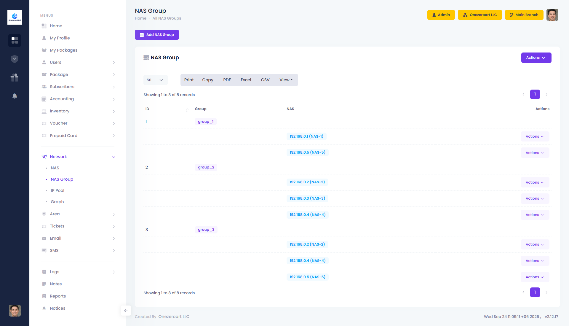 The NAS Group module is used to organize and manage multiple Network Access Servers (NAS) under a single group. By grouping NAS devices, administrators can easily assign users, apply policies, and monitor connections across different servers. This ensures better scalability, centralized management, and improved control over subscriber authentication and network access.