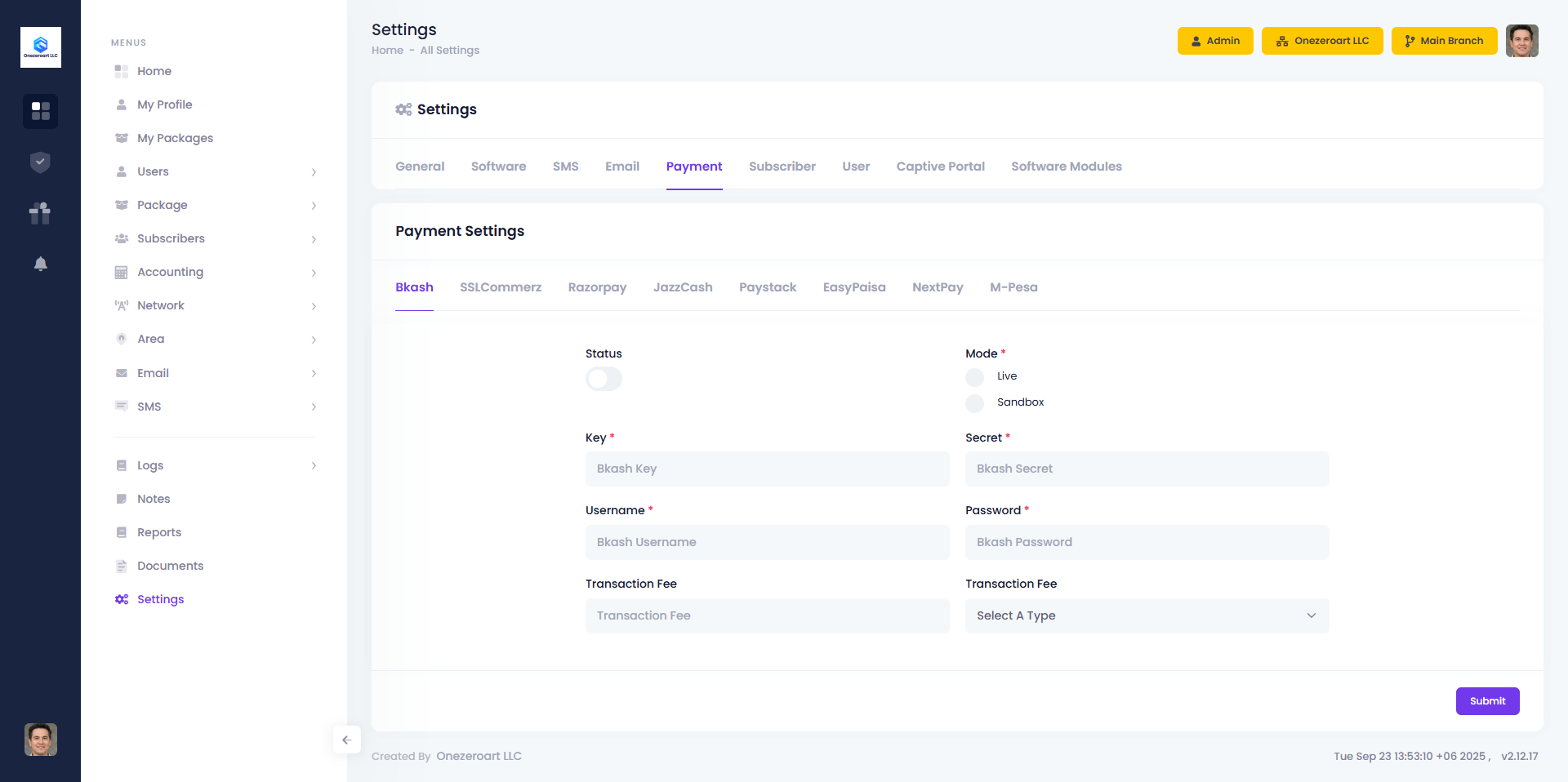 Configure the Bkash payment gateway in ZalUltra CRM to securely process online payments for your clients. The integration supports both Live mode for real transactions and Sandbox mode for testing purposes, allowing administrators to verify transactions without affecting actual funds. By entering the required API credentials and account details, the CRM can automatically handle payments, calculate transaction fees, and ensure smooth and reliable payment processing for invoices and other financial operations.