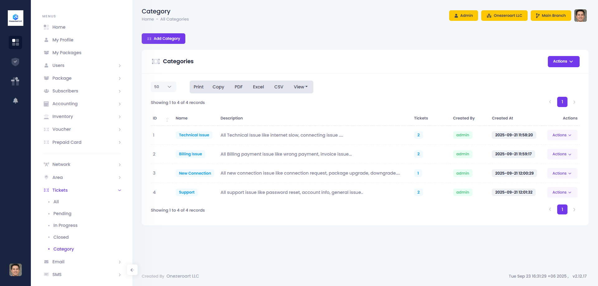 To add a category, click on "Add Category" from the action dropdown menu under ticket categories. Enter the name and description, then submit. The category will be successfully added.