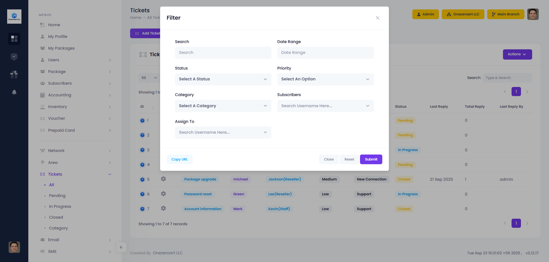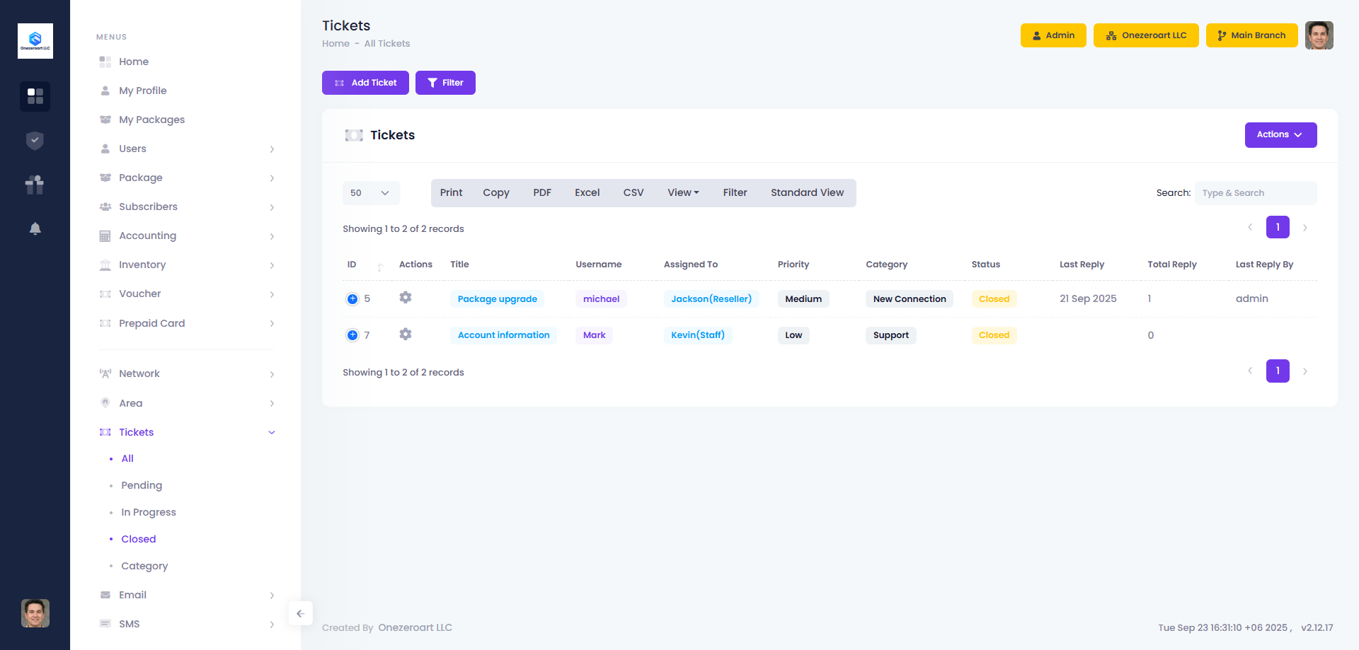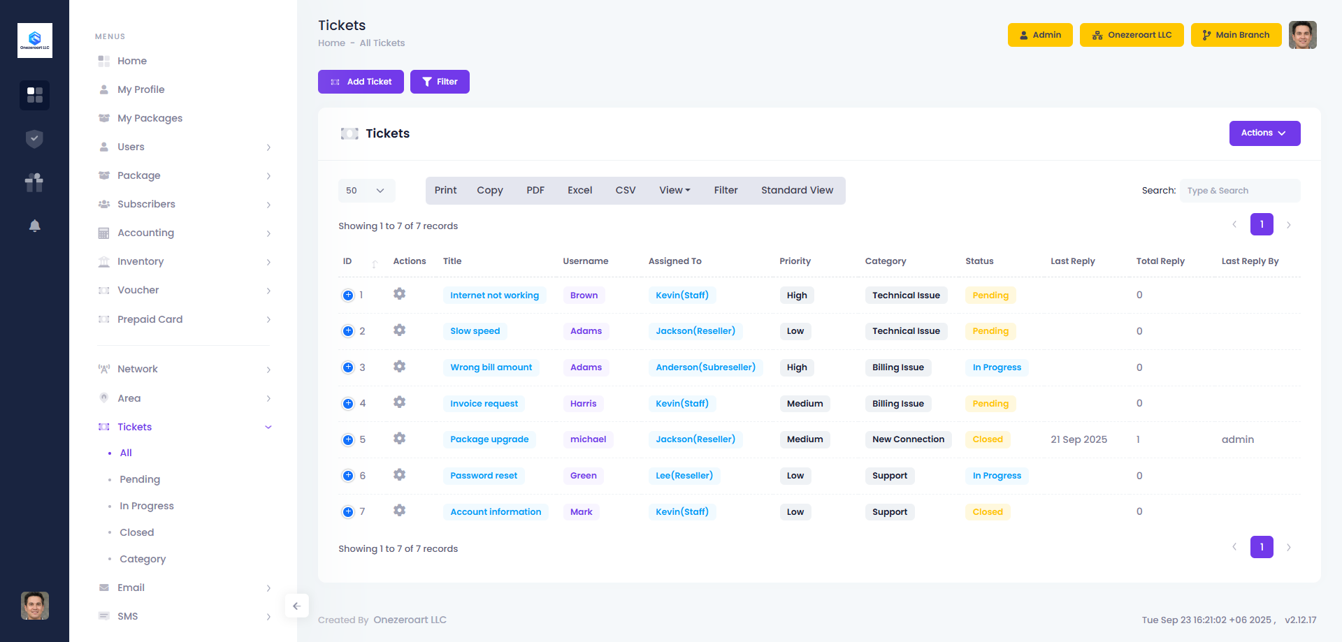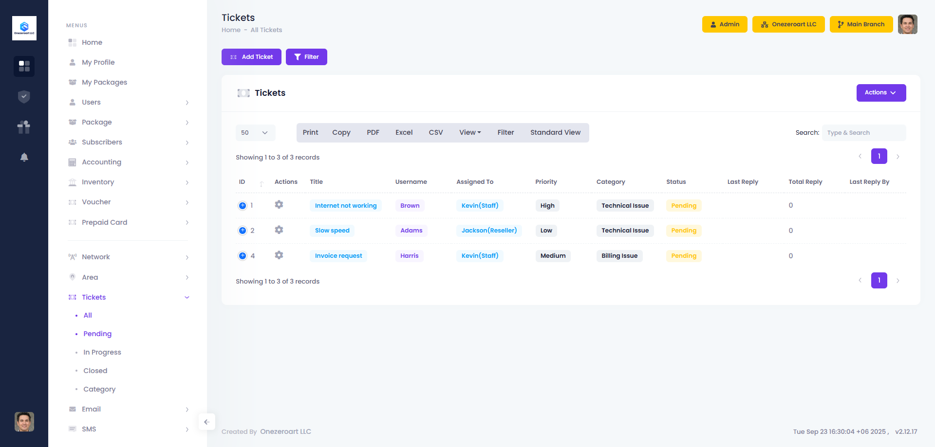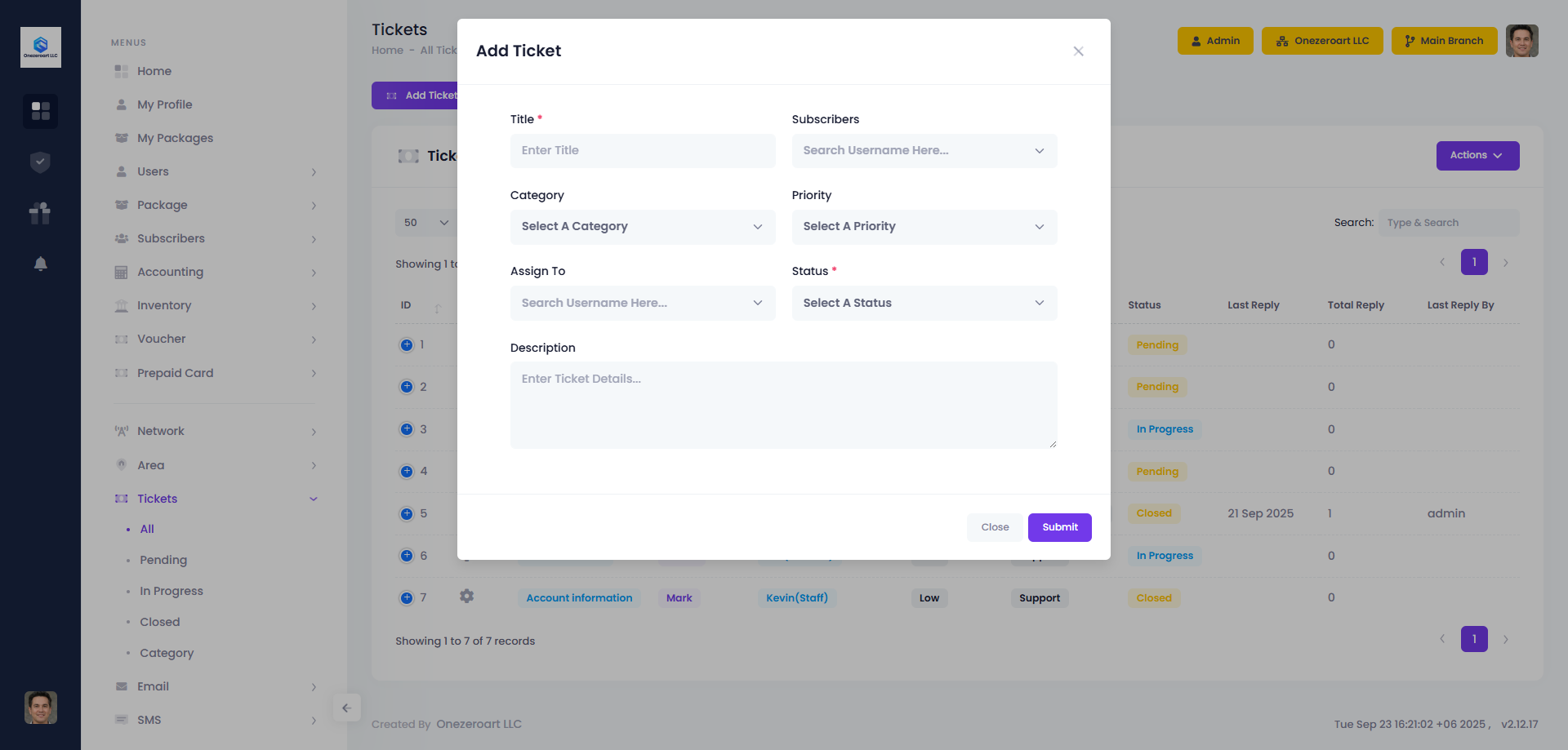 To add a ticket, click on "Add New Ticket" from the action dropdown menu. Enter the title, select the subscriber, category, priority, and assignee. Provide a description, then submit. The ticket will be successfully added.