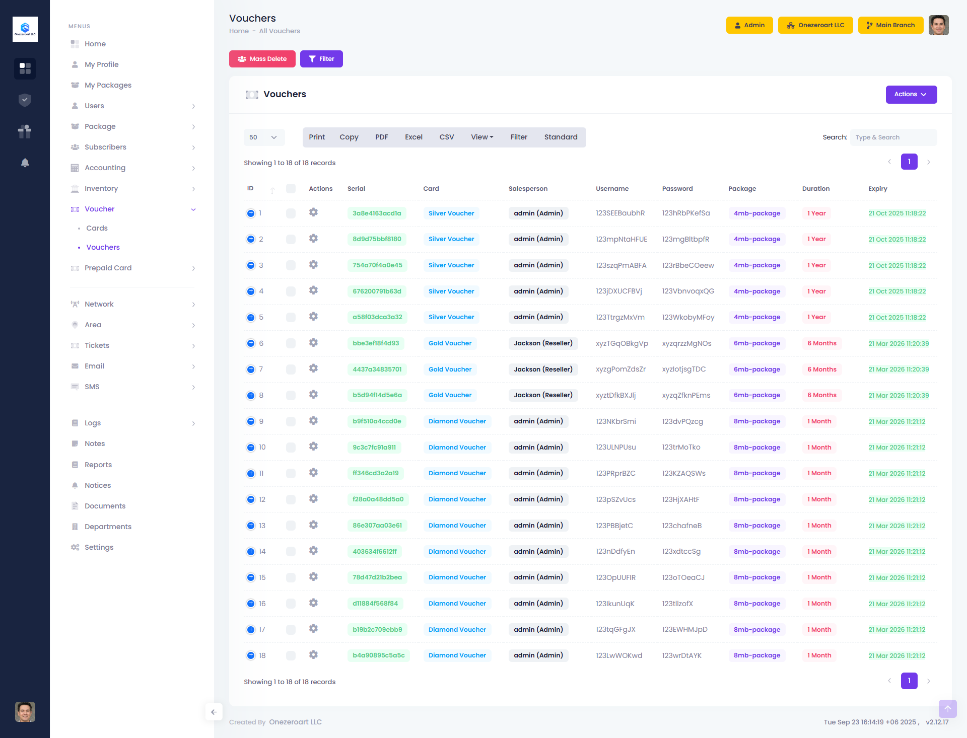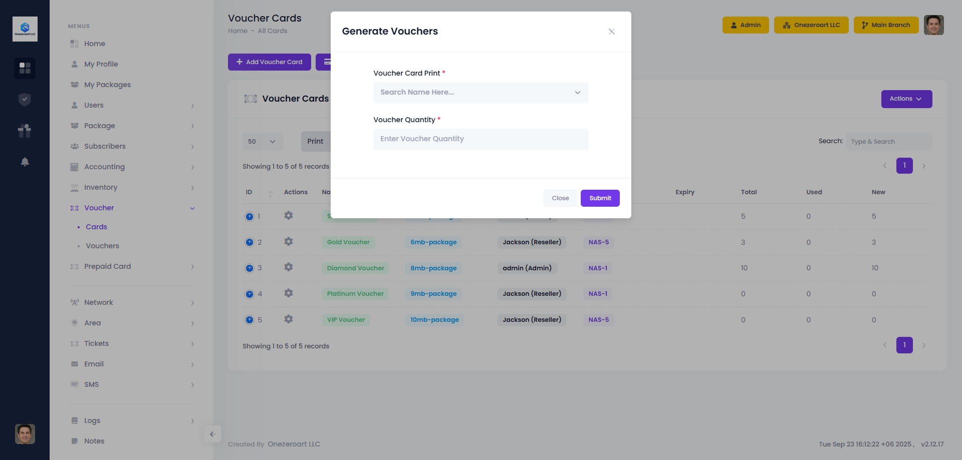 To generate Voucher, click on "Generate Voucher", select the Voucher card, and submit the quantity you want to generate. Each selection will be generated individually.